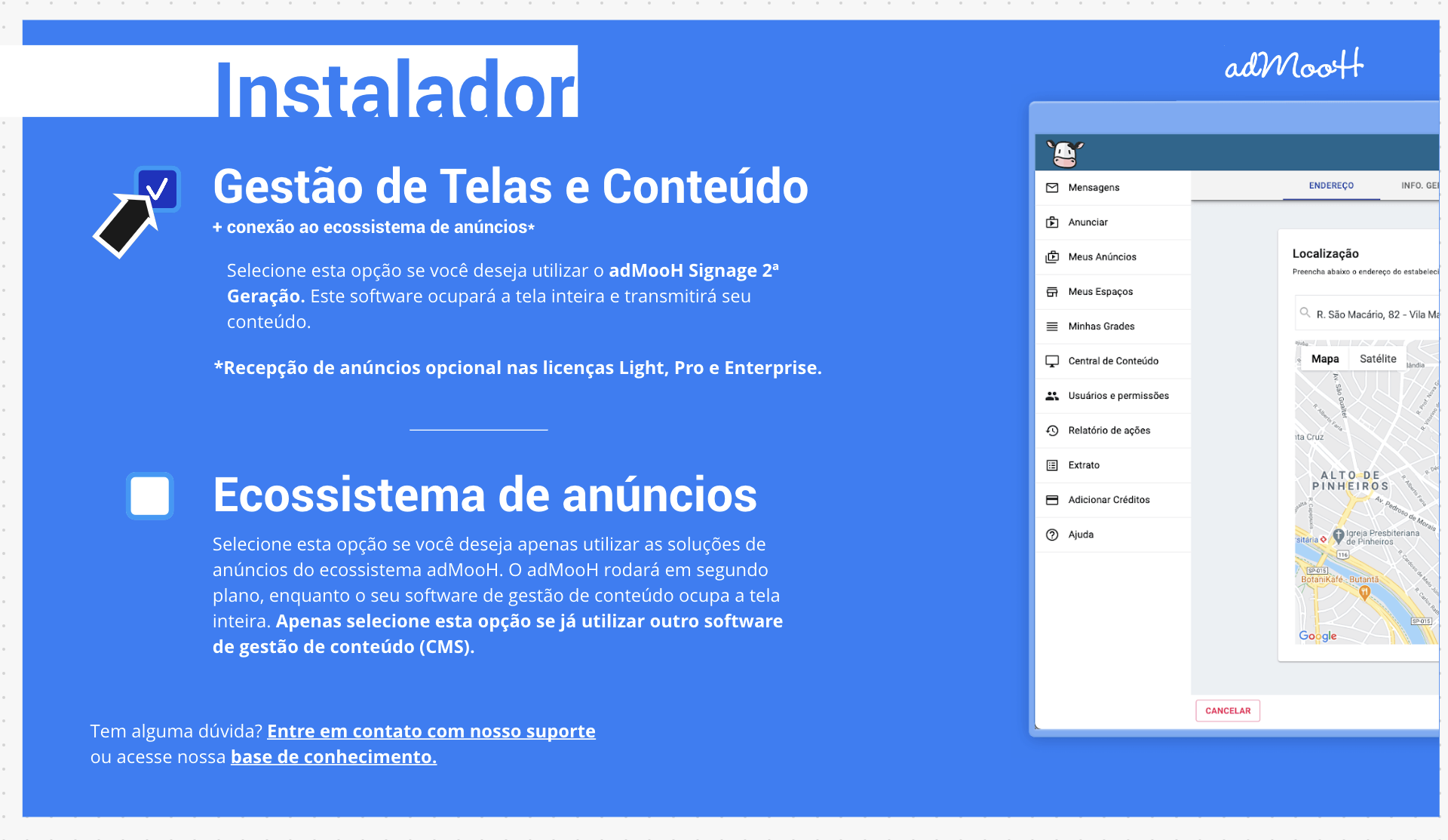 Selecione essa opção caso você irá utilizar o adMooH somente para receber anúncio, mas já utiliza um CMS de outra empresa. adMooH irá rodar em segundo plano e o outro software de CMS irá ocupar a tela toda.