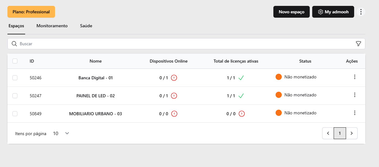 Acesse a plataforma da adMooH, e encontre o espaço cadastrado, ou crie um novo clicando em "Novo Espaço".