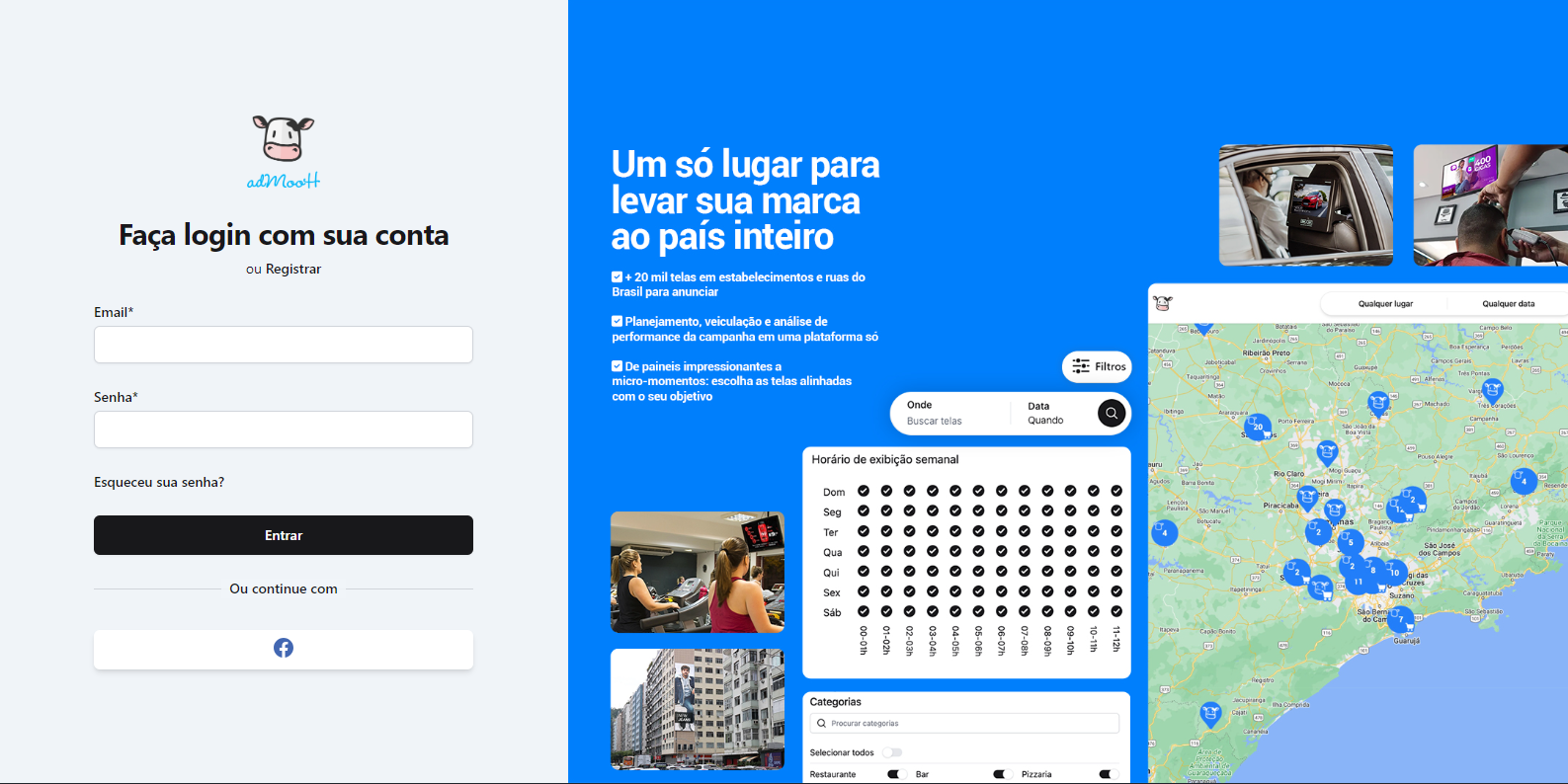 A plataforma de anúncios da adMooH existe para transformar a compra de anúncios em telas fora de casa em algo fácil, customizável e autônomo de forma totalmente digital. Nela, você pode escolher entre milhares de telas, verificar dados e imagens das telas e dos espaços onde estão, e adicioná-las ao carrinho de compras para montar sua campanha.