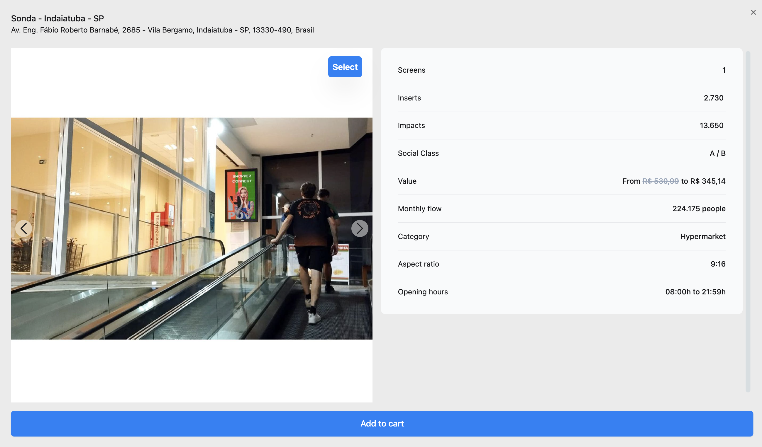 Com base nos filtros aplicados, selecione as telas que melhor atendem à sua campanha clicando em "+" no menu lateral, ou clicando nos pins azuis do mapa.