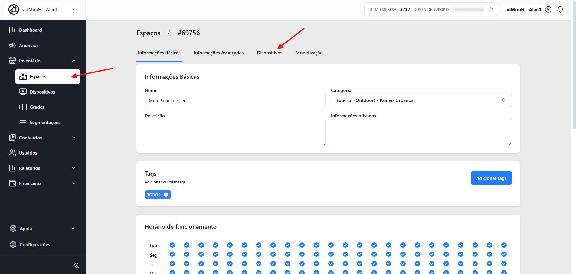 Acesse o menu Espaços e selecione o local onde a tela está instalada.