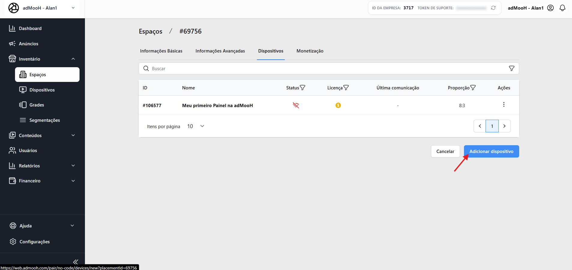 Clique em Dispositivos e depois no botão para Adicionar Novo Dispositivo.