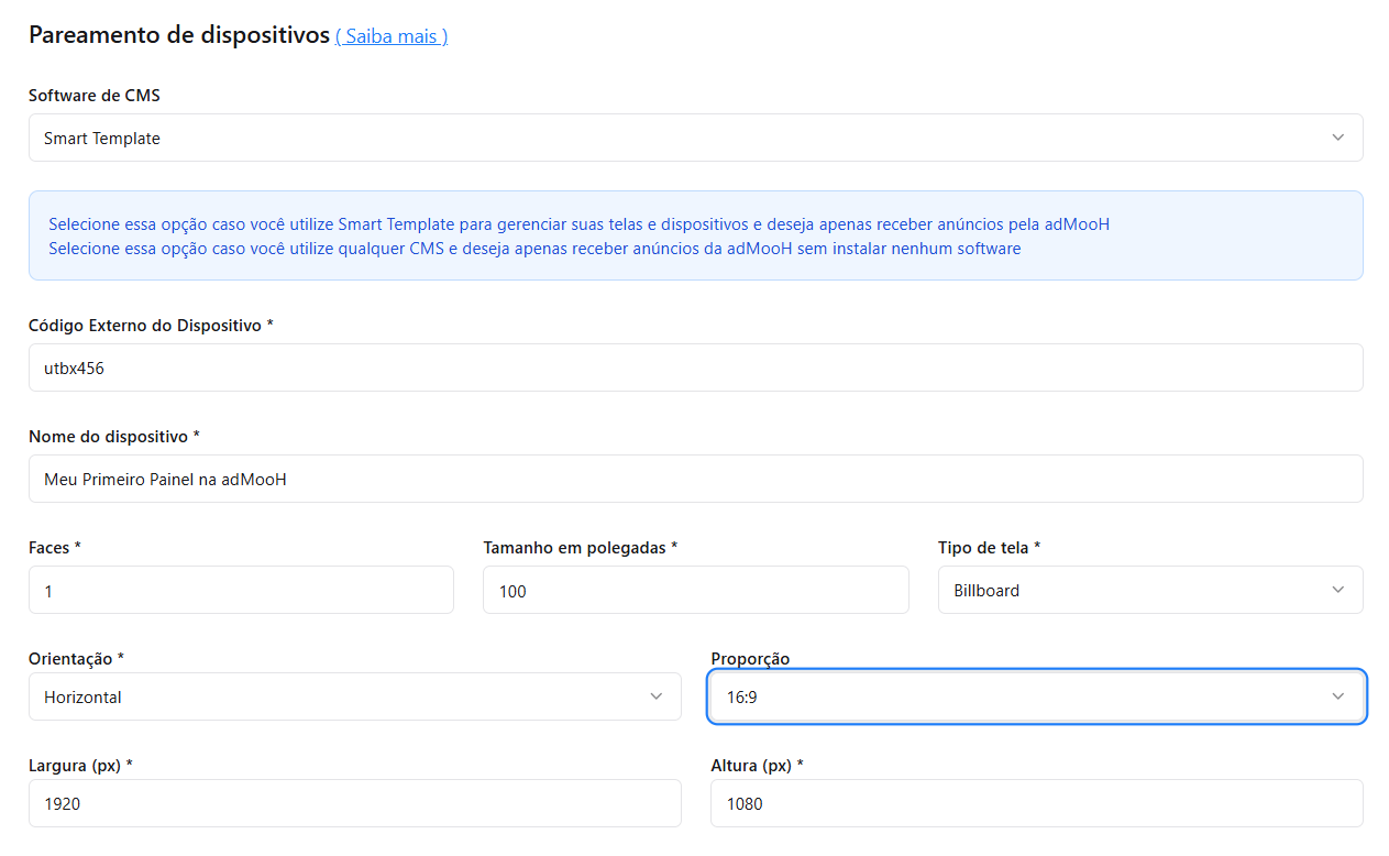 externalid, o player da adMooH realizará o bid buscando a campanha vinculada exatamente ao código (ID) que o seu CMS enviar na URL. Isso elimina a necessidade de pareamento manual tela a tela, automatizando a expansão do seu inventário.