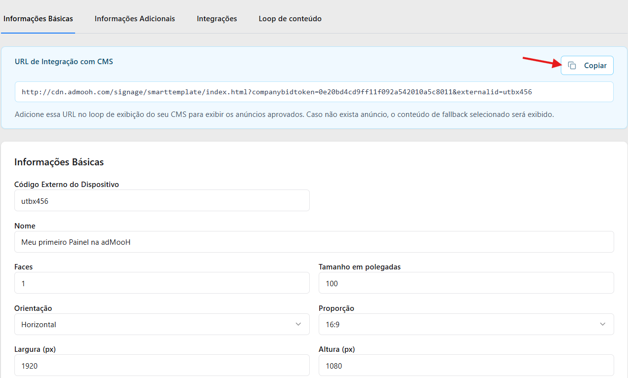 Após salvar, a URL de integração será gerada dinamicamente na aba de Informações Básicas do dispositivo: